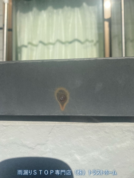 釘部分を見ると、錆びていたり釘のまわりに亀裂がはいっていると要注意です。この釘が錆びて隙間ができたり、亀裂部分から雨水が侵入し雨漏りを引き起こす原因となります。釘穴から水が侵入するとは思ってもみないので、この劣化にほとんどの方は気が付きません。